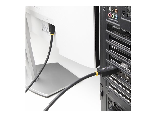 The 3m DisplayPort 2.1 Cable from StarTech.com is engineered for high-performance connectivity with a range of advanced features. This cable supports resolutions up to 8K at 60Hz, ensuring image quality for high-definition displays. With capabilities for 4K at 144Hz and 1440p at 240Hz, it meets the demands of gamers and designers, allowing for smooth visual experiences without lag. Built with a robust and shielded design, this cable includes features such as aluminum mylar foil shielding, EMI protection, and halogen-free materials for safer usage. This makes it a reliable choice for any setting, whether at home or in a professional environment. Additionally, the DisplayPort 2.1 specification allows for a data transfer rate of up to 40 Gbps, accommodating high bandwidth needs for multiple displays connected through a single cable. With support for HDR, 32 audio channels, and compatibility with technologies like G-Sync and FreeSync, this cable enhances video and audio performance. Ensuring durability, it can withstand up to 10,000 insertions while maintaining a 600 bend lifespan.