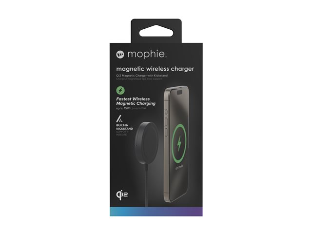 The ZAGG mophie magnetic wireless charger delivers efficient charging for your devices with a sleek and compact design. Supporting Qi 2 wireless charging standards, this wireless charging pad is compatible with cellular phones and wireless earbuds, ensuring that your essential devices remain powered throughout the day. The 15 watt power output enables a quick charge, allowing you to get back to what matters most without delay. With an aluminum body and magnetic alignment, charging has never been more convenient. Additionally, the built-in kickstand adds versatility to your charging routine, while the silicone cable wrap helps keep your setup organized and tidy.