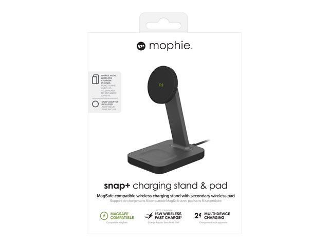 Magnetic Latch+ ladestativ og Pad+ lar deg lade telefonen og hodetelefonene på kort tid. Stativet holder enheten i stående eller liggende modus og leverer opptil 7,5-15 W trådløs kraft. Så du kan se TV-programmer, videochatte eller skanne meldinger mens telefonen er magnetisk festet til snap+-stativet og nettbrettet. Det er til og med et dedikert sted å lade AirPods.
