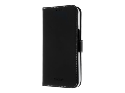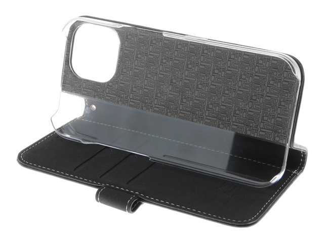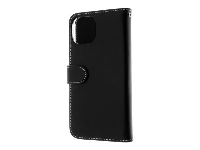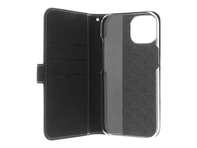 Insmat Exclusive - Lommebok for mobiltelefon - ekte skinn, polykarbonat, kartong+papir+aluminiumsfolie, bomullssting - svart - for Apple iPhone 15 650-3184