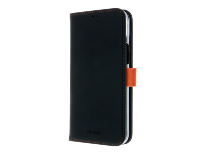 Insmat Exclusive - Lommebok for mobiltelefon - ekte skinn, polykarbonat, kartong+papir+aluminiumsfolie, bomullssting - svart / oransje - for Apple iPhone 15 Plus 650-3193