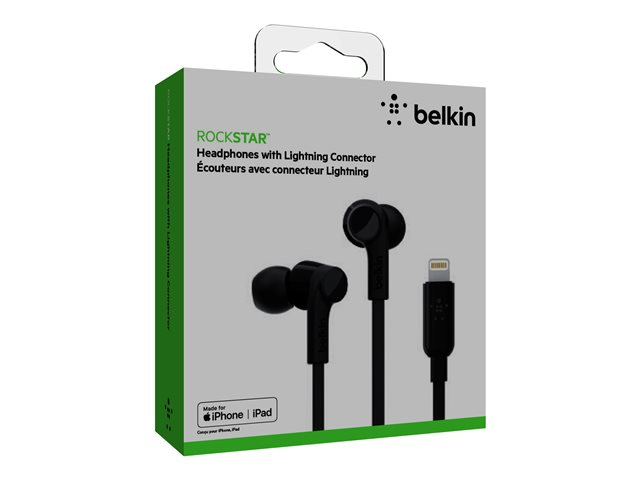 Belkin ROCKSTAR - Ørepropper med mikrofon - i øret - kablet - Lightning - lydisolerende - svart - for Apple 10.5-inch iPad Pro; iPad mini 4; iPhone 7, 7 Plus, 8, 8 Plus, X, XR, XS, XS Max