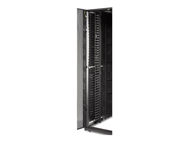 The vertical channels have smooth plastic fingers at 1U increments to allow patch cords to enter and exit in an organized manner.