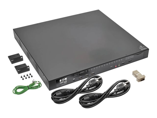 Tripp Lite's 16-port NetDirector Cat5 IP KVM Switch is the optimal solution for remotely controlling multiple computers (combination of PS/2, USB and Serial) by up to 3 (1 Local and 2 Remote) independent, simultaneous users. Both DVI and VGA console ports are included for connection of either a DVI or VGA monitor. High video resolution: up to 1920 x 1200 @ 60Hz - 24 bit color depth for the local console; up to 1920 x 1200 @ 60Hz with 24 bit color depth for remote sessions at up to 164 ft. (50 m). A full-screen graphical OSD with multi-level authentication (Super Administrator, Administrator and User) allows you to quickly and efficiently manage your installation, and can be displayed in English, German, Russian, Japanese, traditional Chinese and simplified Chinese. Critical events on the installation can be tracked via email notification, SNMP traps, the Windows based log server or Syslog server. Accessing the connected computers is a breeze; view multiple computers at the same time using panel array mode, automatically sync USB mice, access the on-screen keyboard feature in numerous language formats. Virtual Media allows computers connected using a B055-001-USB-V2 Server Interface Unit to access DVD/CD drives, flash drives and other storage media as if they were directly connected to the computer. In addition, three USB ports are located on the front panel of the unit for use with Virtual Media or an external keyboard and mouse. Also located on the front of the KVM is a USB Mini-B port that allows for direct connection of a laptop for easy console operation of the switch. Other features include FIPS 140-2 level 1 security standards support, dual power supplies that allow the unit to continue running in the event one power supply stops receiving power, temperature sensors that control the speed of the unit's cooling fans, remote authentication support via RADIUS, LDAP, LDAPS and Active Directory, dial-in modem access and non-browser access using Windows and Java applications. Constructed of heavy-duty steel housing.
