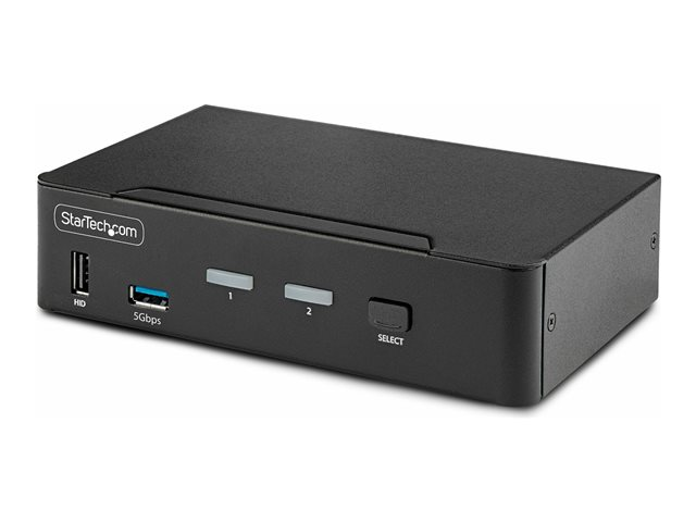 Share and switch between two USB-A and DisplayPort-enabled computers, using this DisplayPort KVM Switch. Share an 8K 60 Hz DisplayPort monitor, a keyboard and mouse, two USB 5 Gbps devices, and two additional USB 2.0 devices.