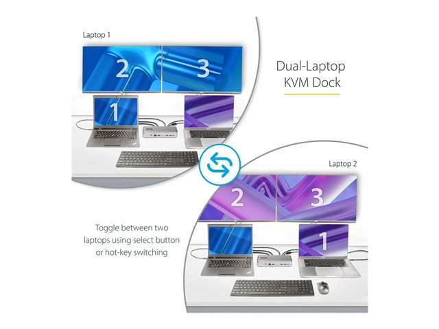 StarTech.com Dual-Laptop USB-C KVM Docking Station, Dual Monitor 4K 60Hz DisplayPort Dock, 5-Port USB Hub, GbE, 90W/45W Power Delivery to Two Laptops, Windows/Mac, 2-Host KVM Dock - Dokkingstasjon - USB-C 3.2 Gen 2 - 2 x DP - 1GbE - TAA-samsvar