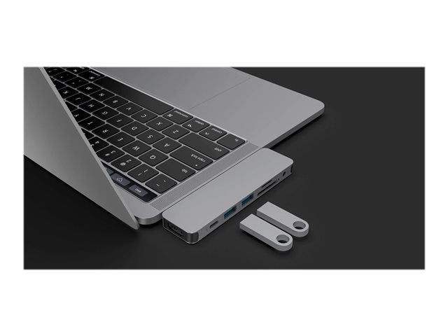 Form-fitting USB-C Hub for MacBook Pro and Air. This USB-C docking station attaches to MacBook adding 8 ports: 4K HDMI output, USB-C power delivery, and more.