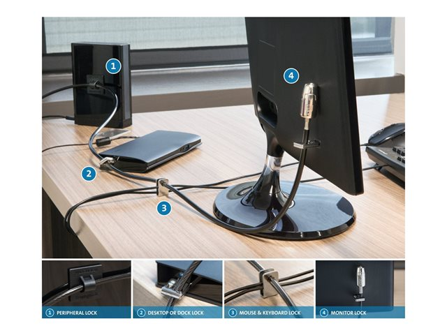 The locking kit represents the next generation of desktop device security so you can lock down a computer, two peripheral accessories and a wired keyboard and mouse. Developed using strict specifications and advanced technologies, the locking kit can stand the test of time in a smaller, compact size without compromise.